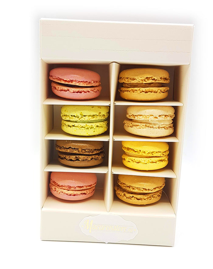 Macarons de Paris met heerlijke smaken: aardbeien, Pistache, Citroen, Koffie, chocolade en vanille. We leveren een lekker mix van smaken. Bereid met verse amandelen.