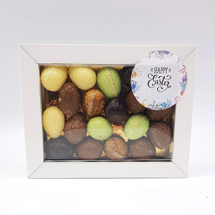 Oeufs de Pâques faits à la main en pur, lait et blanc dans différentes garnitures. Les œufs de Pâques les plus savoureux enveloppés dans un cœur romantique. Ce sont des bonbons belges en forme d'œuf de Pâques. Contenu 170 grammes.